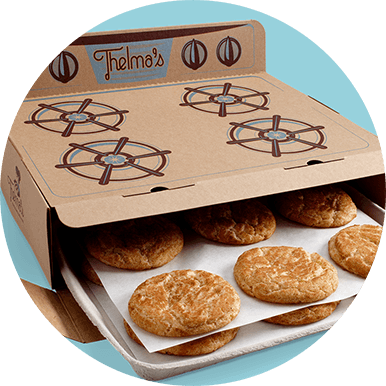 We had a thought that matches our out-of-the-box approach to cookie-making: what if the treats came hot right out of the oven? That’s when we cooked up Thelma’s signature oven box. Infused with whimsy and warm spirit, our patented box became a viral sensation that won Thelma’s international recognition.