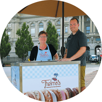 When Dereck (son) and Lana (mom) started selling handmade ice cream sandwiches from a little pushcart at the Des Moines Farmer’s Market, they ran out before they knew it: customers couldn’t keep their hands off the sweet treats. From a small start to a rapid rise, we now spread the love all across the country. Using our 108-year-old Great-Grandma Thelma’s original snickerdoodle recipe, we have grown leaps and bounds to serve hundreds of stores. And customers still can’t get enough.